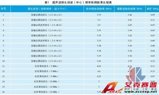 為了驗證測試結果的正確性,采用本文中的裝置和方法對16個超聲波探頭回波頻率進行測試,并與北京航空材料研究院無損檢測研究室探頭頻譜檢測結果進行了比對,結果見表1。可以看出,測試結果與航材院無損檢測研究室檢測結果具有很強的一致性,差值范圍在0.01MHz~0.13MHz之間。