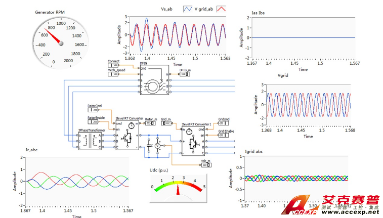 上圖為艾克賽普為最終客戶(北方某大學(xué))搭建的雙饋風(fēng)機(jī)實(shí)時(shí)仿真系統(tǒng)的實(shí)驗(yàn)室照片,圖中可以看到實(shí)時(shí)仿真器(PXI)與變流器控制器(CompactRIO)。