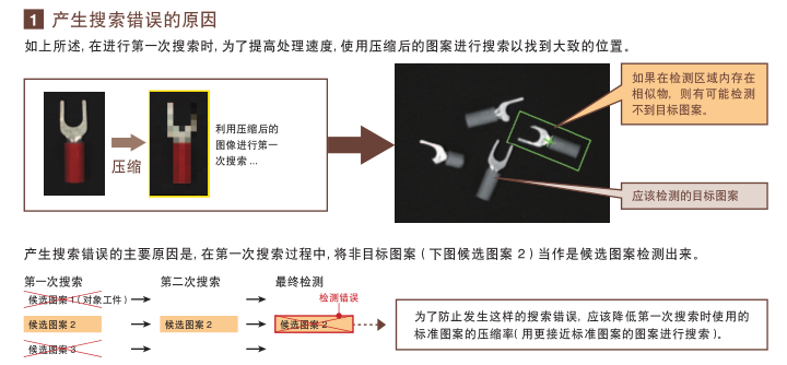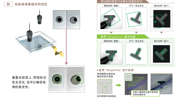 除了利用正規(guī)化相關(guān)法的圖案搜索之外,還有一種基于檢測對象輪廓的 “ 幾何形狀搜索 ”。本公司生產(chǎn)的 CV 系列“ShapeTrax” 就具有這樣的功能。“ShapeTrax” 根據(jù)輪廓數(shù)據(jù)進(jìn)行搜索,因此在搜索對象有缺損時(shí),也可以根據(jù)殘留的形狀數(shù)據(jù)進(jìn)行正確的搜索。除此之外,還可以根據(jù)對象的尺寸的變化、黑白反轉(zhuǎn)等表面狀態(tài)的變化做出正確的處理,從而可以確保檢查效果。