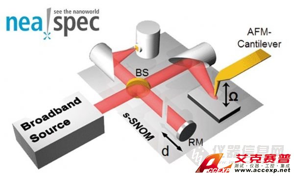 2013年,Neaspec公司推出了nano-FTIR光譜儀,利用其獨有的散射型近場光學技術發展出來的納米傅里葉變換紅外光譜技術,使得納米級化學鑒定和成像成為可能。nano-FTIR光譜儀的工作原理如圖3所示,將一束寬帶中紅外激光耦合進入近場顯微鏡(NeaSNOM),對原子力顯微鏡(AFM)針尖進行照明, 通過一套包含分束器、參考鏡和探測器在內的傅里葉變換光譜儀對反向散射光分析,即可獲得針尖下方20 nm區域內的紅外光譜,使得紅外光譜成像系統的的空間分辨率突破了微米的界限。該類型儀器綜合了AFM的高空間分辨率,和FTIR的高化學敏感度,實現了對有機、無機材料的納米級化學分辨。