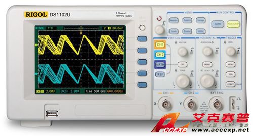 RIGOL推出的另一款電商專賣產品是價格1580元,具有100MHz帶寬,1Gs/s采樣率的雙通道經典款DS1102U數字示波器。這款產品除了具有性價比優勢外,還具有各種實用功能:它具有獨特的交替觸發功能,可以將兩路不同頻率信號穩定顯示分析;還具有軟件實現的波形錄制功能(記錄多達1000幀波形)、標配通過/失敗測試功能、觸發電路靈敏度可調功能等。為了方便操作,它具有在線聯機幫助功能,不熟悉的人也可以輕松學會所有操作。