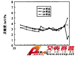 實(shí)驗(yàn)樣品采用北京信息工程學(xué)院研制的YLC-A型壓電式微壓傳感器,樣品數(shù)為3只。將傳感器安裝在測(cè)試腔蓋樣品架上,輸出端與腔蓋上的樣品輸出引線連接,扣緊腔蓋,按圖1所示連接系統(tǒng)。由于傳感器內(nèi)裝前置放大器,需提供直流電源工作,電源加在腔蓋上被測(cè)傳感器輸出端。調(diào)節(jié)信號(hào)發(fā)生器產(chǎn)生正弦信號(hào),信號(hào)幅度不宜過(guò)大,以避免傳感器輸出失真。選取多個(gè)信號(hào)頻率,分別測(cè)量每個(gè)頻率點(diǎn)兩傳感器的輸出電壓,在1kHz處示波器上的標(biāo)準(zhǔn)傳感器波形(1)的峰-峰值電壓為145.5mV;被測(cè)傳感器波形(2)的峰峰值電壓為5.85V。將V標(biāo)和V測(cè)代入式(1)算出被測(cè)傳感器的靈敏度。根據(jù)計(jì)算結(jié)果繪制傳感器的靈敏度隨頻率變化曲線,如圖2所示,從而得到傳感器的頻率響應(yīng)范圍。