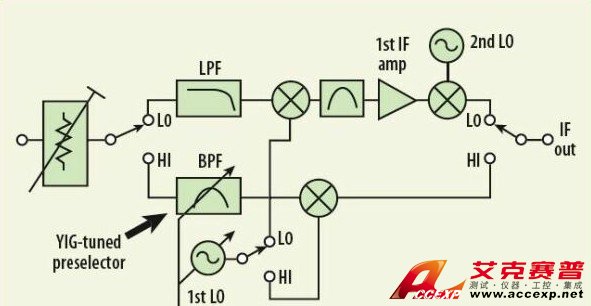 工作在26.5GHz的現(xiàn)代頻譜分析儀具有一個“低頻帶”和一個“高頻帶”信道,如圖1所示。低頻帶通常可工作在3GHz或更高頻率。在低頻帶上,信號上變頻到接近4GHz或更高的高IF頻段,然后再下變頻到接近300MHz的較低IF頻段。這種雙變頻方式可以極大地減少混頻器鏡像響應。