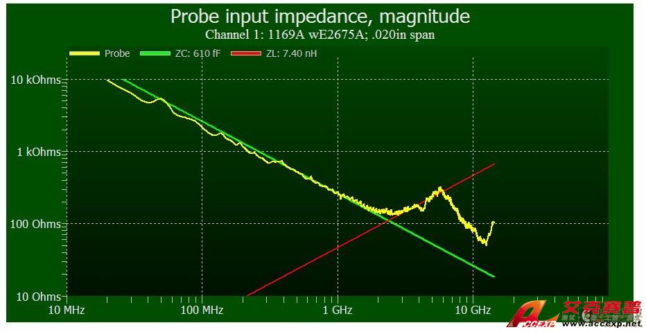 圖 1b Agilent PrecisionProbe 圖顯示了1169A 探頭放大器(配有 E2675A 探頭)的探頭輸入阻抗。理想探頭在所有頻率上均具備最大阻抗