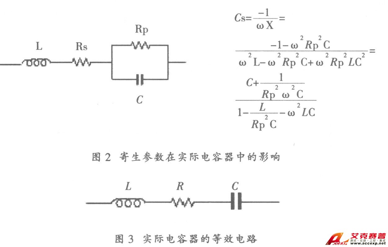 電容器的典型等效電路如圖1 所示, 在該電路中, 電容量C 是電容器的主要成分, Rs 和L 是引線和電極中存在的寄生參數(shù), Rp 代表兩個電極間的寄生泄漏參數(shù)。