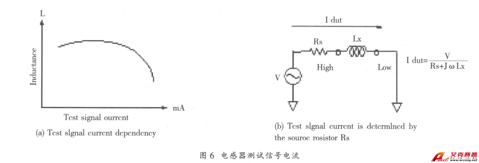 磁性電感器與測試信號電流的關(guān)系如圖6 (a)所示。電感量隨測量電流的大小而不同, 即使將兩臺不同的儀器設(shè)置為同樣的輸出電壓, 如果它們的源阻抗不同, 它們的輸出電流也將不同, 請參考圖6 (b)。有些磁性電感器的電感量與流過電流的關(guān)系很大, 電流的變化可導致電感值成倍地變化。我們多次遇到元件制造廠與元件使用廠家的糾紛就源于此。他們用不同的儀器測量同一產(chǎn)品的結(jié)果有很大的不同, 進而懷疑儀器有問題, 但儀器經(jīng)過我們計量校準是合格的。其實就是因為儀器的源阻抗不同而導致通過測試件的電流不同, 測量結(jié)果當然也就不一致。因此一些高檔的LCR 表有電壓、電流監(jiān)視器功能, 可監(jiān)測實際加在測試件上的電壓及流過測試件的電流。