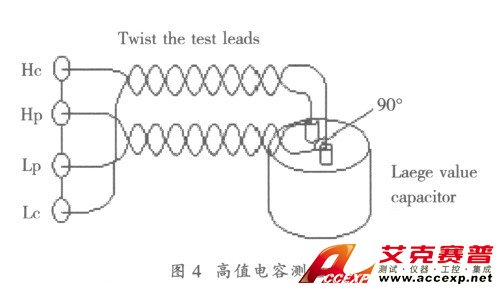 在電容器的測量中, 應注意的事項與被測電容量有關(guān), 高值電容測量屬于低阻抗測量, 因此必須把接觸電極、測試夾具和電纜中的接觸電阻及殘余阻抗減到最低, 應使用4 端、5 端或4 端對配置把DUT 接到儀器上。在使用4 端和5 端配置時, 必須確保高測試信號電流流過電纜, 為避免電磁場耦合的影響, 按圖4 所示的方式來連接電纜;此外, 為進行精確測量, 應正確使用開路、短路補償。特別是對于施加直流偏置電壓的電解電容器,應在直流偏置設(shè)置為ON (0 V) 時進行開路/短路補償。