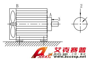 測振過程中,測點的選擇直接影響監(jiān)測結果,測點的選擇原則是:1、要盡量靠近振源;2、要盡量對準振動方向 3、便于多方位測量。例如,對旋轉機械而言,測點應盡量靠近軸承。電機自由端一般有后風扇罩,其測點選擇在風扇罩固定螺絲有較好監(jiān)測效果,由于軸承振動的方向是不確定的,通常可取軸向和徑向;如圖 3 所示,三個方向(軸向、垂直徑向、水平徑向)可確定測點的振動情況:A 點測三個方向,B 點只能測二個方向,但軸向振動的好壞可從 A 點反映出來。