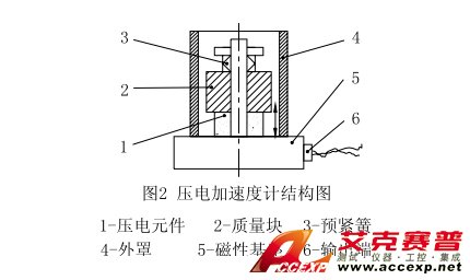 測振儀的種類很多,且有許多升級產品,如振動分析儀、軸承分析儀、頻譜儀等,它們都是通過傳感器工作的,本文以加速度傳感器為例介紹測振儀的工作原理。測振儀工作時通過加速度傳感器采集測點的振動值,分析計算后得出該點的加速度、速度和位移的峰值,這里筆者以壓電式加速度傳感器為例說明其原理,見圖2。將傳感器磁性基座吸附在被測點表面,振動引起質量塊往復運動,壓電元件受壓后產生壓電效應,電信號通過輸出端傳入主機。主機根據電信號的強弱及頻率特征首先計算出加速度,再根據加速度值一次和二次積分分別計算出速度和位移值。加速度、速度和位移分別從不同角度反應振動的優(yōu)劣。