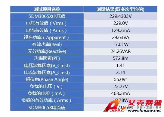 為驗(yàn)證負(fù)載的實(shí)際功率。我們把SDM3065X作為電流表接入到負(fù)載電路中,如圖6所示;同時(shí)把高壓差分探頭和電流探頭接入到負(fù)載電路中。在功率分析中,選擇電壓均方根、電流均方根、有效功率。結(jié)果如圖7所示: