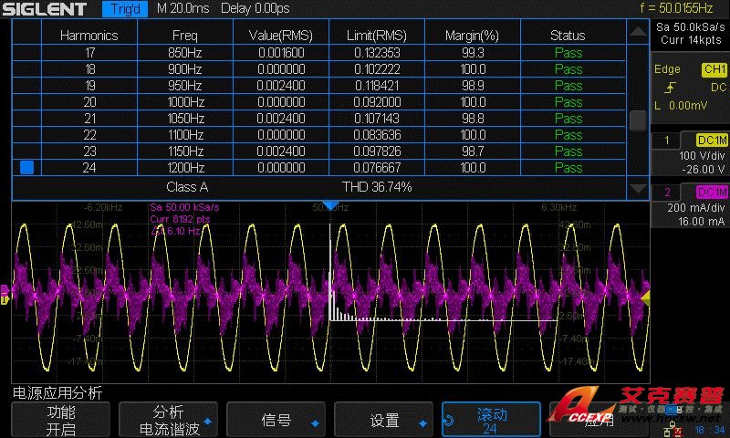 6. 按下“應(yīng)用”軟鍵,將執(zhí)行電流諧波分析。屏幕上會(huì)顯示使用Hanning窗計(jì)算的FFT波形,F(xiàn)FT波形顯示了輸入電流中的頻率分量。下圖即顯示了各諧波的測(cè)量值。
