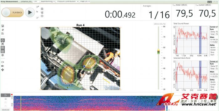 聲學(xué)相機(jī)的用戶界面所顯示的噪聲云圖、三維頻譜圖、頻譜成分和聲功率