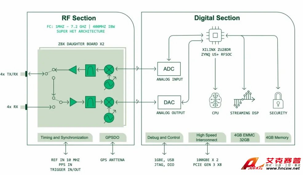 NI Ettus USRP X410專為 1 MHz 至 7.2 GHz 的頻率而設(shè)計,最高可調(diào)諧至 8 GHz,并具有兩級超外差架構(gòu),具有 4 個獨立的 TX 和 RX 通道,每個通道均具有 400 MHz 的瞬時帶寬。用于數(shù)據(jù)卸載和控制的數(shù)字接口包括兩個支持 100 GbE 的 QSFP28 接口、一個 PCIe Gen3 x8 [3] 接口以及標(biāo)準(zhǔn)命令、控制和調(diào)試接口:USB-C JTAG、USB-C 控制臺、以太網(wǎng) 10/100 /1000。NI Ettus USRP X410 是一款基于 Xilinx Zynq Ultrascale+ ZU28DR 射頻片上系統(tǒng) (RFSoC) 的一體化器件,具有內(nèi)置數(shù)字上下變頻和板載軟判決前向糾錯 (SD-FEC) IP。