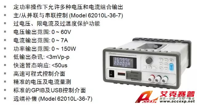 Chroma 62000L系列可程控直流電源供應器具傳統(tǒng)Linear穩(wěn)壓器之輸出低雜訊、高速暫態(tài)響應特性,同時具備Switching穩(wěn)壓器的輕型化、小體積及低成本等特性,提供許多獨特功能供自動化測試系統(tǒng)整合、車用電子MCU/ECU測試、半導體驅(qū)動電源及無線通信電源使用,是一高性價比的可程控直流電源供應器,設計為滿足有嚴格要求的新一代電力電子應用。