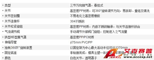 臺雄SAN-6103M三節萬向抽氣罩采用高密度PP材質,可360°旋轉調節方向,易拆卸、重組及清洗,不易老化之高密度橡膠,使用304不銹鋼精制而成。