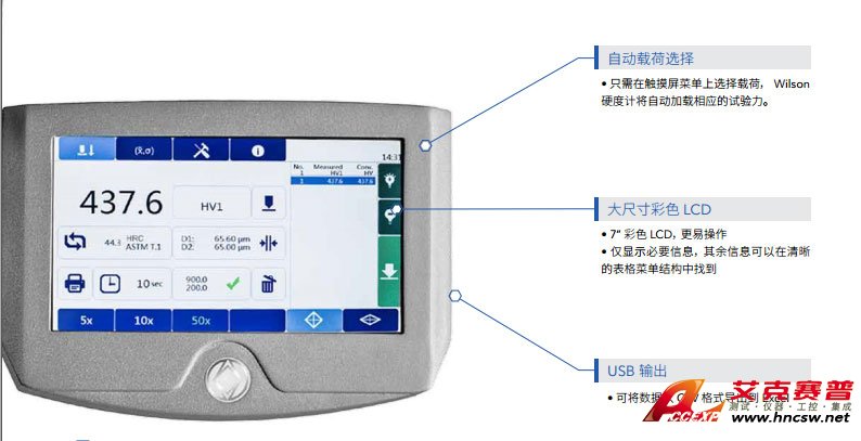 Wilson 智能界面具有“測試”、“統計”、“設置” 等 Tabs 菜單, 采用大尺寸 7” 彩色 TFT 顯示屏, 使用更加方便舒適。 顯示屏安裝在一個可 360 度旋轉的臂架上, 可以調整獲得完美的人機工程學工作位置。 VH1150 配備有 USB 端口, 將數據以 CSV 格式導出至 U 盤中, 從而通過 MS Excel 在 PC 上進行數據分析。 其它的高級功能包括擴展的統計功能、 省電模式、 凹形或凸形試樣形狀校正等, 并可根據 ASTM E140 和 ISO 18625 將硬度值轉換為洛氏、 布氏硬度值或強度。