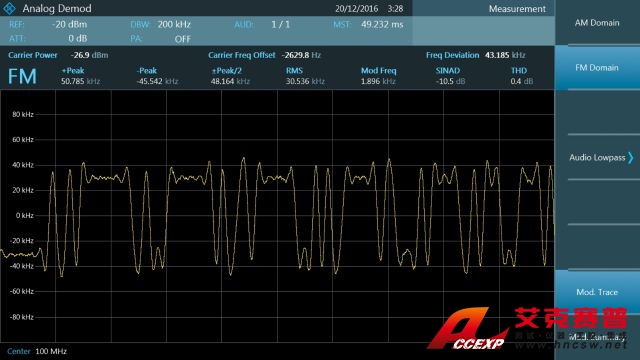 調(diào)制分析(FPC-K7):AM、FM、ASK、FSK。模擬解調(diào)顯示器可顯示波形和測(cè)量參數(shù)摘要,例如載波功率、載波偏移、AM 信號(hào)的調(diào)制指數(shù)(深度)、FM 信號(hào)的頻率偏差、SINAD 以及 THD 等。數(shù)字調(diào)制顯示器包括軌跡、眼圖、調(diào)制錯(cuò)誤和符號(hào)析。此外,還提供 低功耗(Bluetooth? LE)和胎壓監(jiān)測(cè)系統(tǒng)(TPMS)的專有配置預(yù)設(shè)。