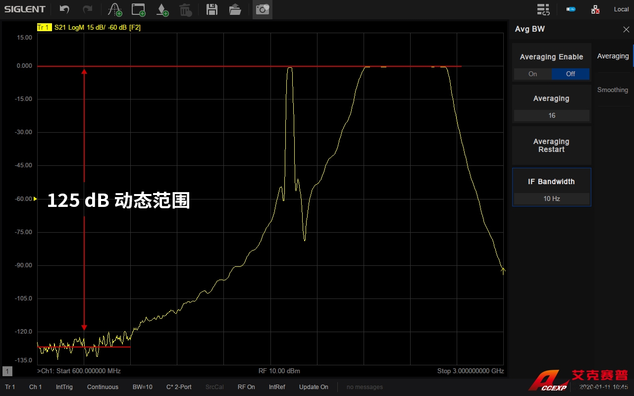 簡(jiǎn)介:低噪聲,高動(dòng)態(tài)范圍系統(tǒng)動(dòng)態(tài)范圍是VNA一個(gè)非常重要的指標(biāo),它是VNA源的最大輸出功率與測(cè)試端口本底噪聲的差值。SNA5032A 擁有最大125 dB的動(dòng)態(tài)范圍,可適用于對(duì)動(dòng)態(tài)范圍要求比較高的測(cè)試場(chǎng)景,比如同時(shí)測(cè)量濾波器的通帶和帶外抑制性能。...