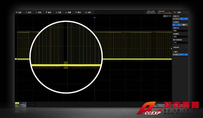 根據奈奎斯特采樣定律,為了保證采樣后的數字信號能完整復原真實信號的信息,一般實際應用中需要保證采樣率為信號最高頻率的2.56~4倍。SDS7304A H12示波器的采樣率最高達20 GSa/s,是最高帶寬的5倍,能完美避免因采樣率不足而導致的信號失真。再搭配上最大1 Gpts/通道的長存儲深度,在長時間捕獲波形的同時,依然能使用更高的采樣率高保真捕獲波形,充分發揮4GHz帶寬性能。