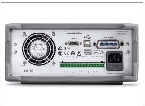 Series 2230G 電源后面板,顯示了 USB、GPIB 和 RS-232 接口和 后面輸出、來(lái)源及全部三條通道的傳感線端子塊。