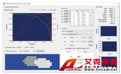 由于太陽能電池利用率不僅與其內(nèi)部特性有關(guān),還受到天氣、季節(jié)、溫度、照度、云遮、下雨和下雪等因素的影響,在不同的時段會具有不同的I-V特性。因此光伏逆變器必須具備應(yīng)對策略,實時調(diào)整太陽能電池的工作點,使之始終工作在最大功率點附近,這一過程就稱之為最大功率點跟蹤MPPT。IT6000PV系列標(biāo)配的太陽能電池矩陣仿真軟件可以在實驗室的測試環(huán)境下,去直接模擬各種真實條件下的太陽能電池陣列,從而測試光伏逆變器的靜態(tài) & 動態(tài)最大功率點追蹤效能。
