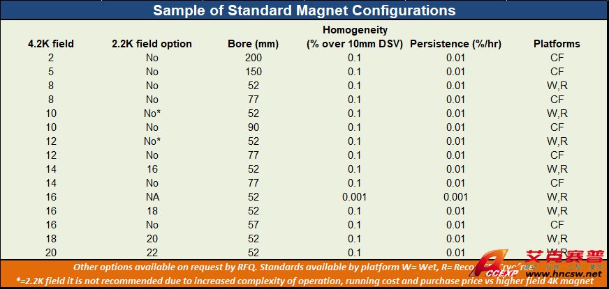 濕式磁體可提供在2 K時達8-20 T標準選項