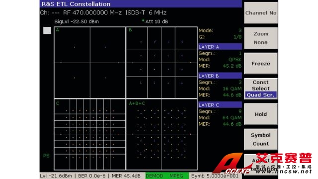 R&S ETL 電視信號分析儀是一款多合一解決方案。它在單臺儀器上集成了電視和調頻(廣播)信號分析儀、視頻分析儀、MPEG 碼流分析儀以及頻譜分析儀的功能。R&S ETL 還包含了模擬音視頻信號發生器和 MPEG-2 碼流發生器。