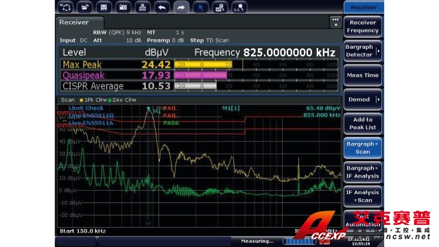 R&S ESRP EMI 測(cè)試接收機(jī)專(zhuān)用于開(kāi)發(fā)階段的診斷測(cè)量和預(yù)一致性測(cè)量,以便產(chǎn)品準(zhǔn)備好接受最終的認(rèn)證測(cè)試。在 10 Hz 至 7 GHz 的頻率范圍內(nèi),接收機(jī)使用傳統(tǒng)的步進(jìn)式頻率掃描或基于 FFT 的時(shí)域掃描(可大幅加快測(cè)量)測(cè)量電磁干擾。R&S ESRP 也可作為功能全面、強(qiáng)大的信號(hào)與頻譜分析儀,并適用于實(shí)驗(yàn)室應(yīng)用。R&S ESRP 配備觸摸屏和直觀的菜單結(jié)構(gòu),易于在任何模式下進(jìn)行操作。